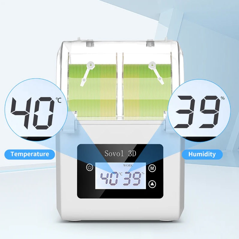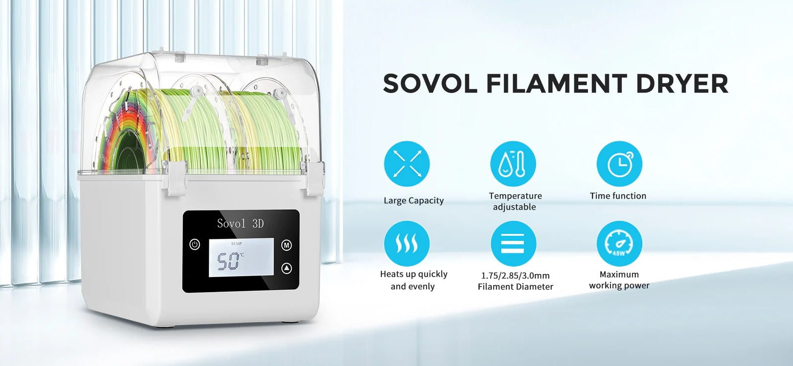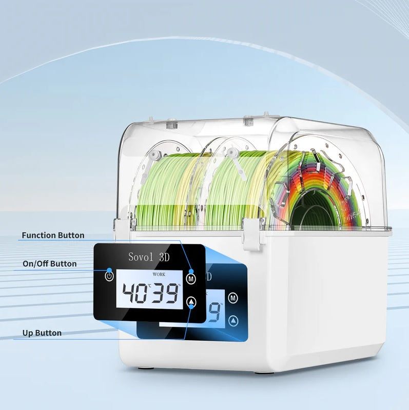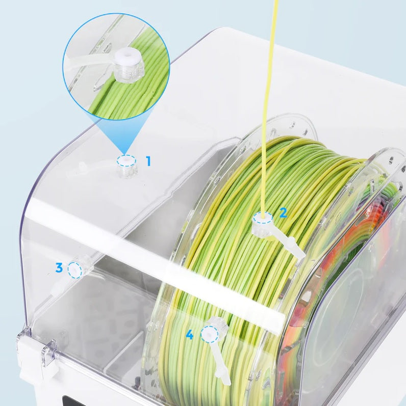 Sovol dryer box can store 2 rolls of 1kg spools.The outlet structure adopts a silicone cable sheath and Teflon tube, 4 holes to choose according to your needs,the outlet is smooth and can be covered with a plug when not in use.